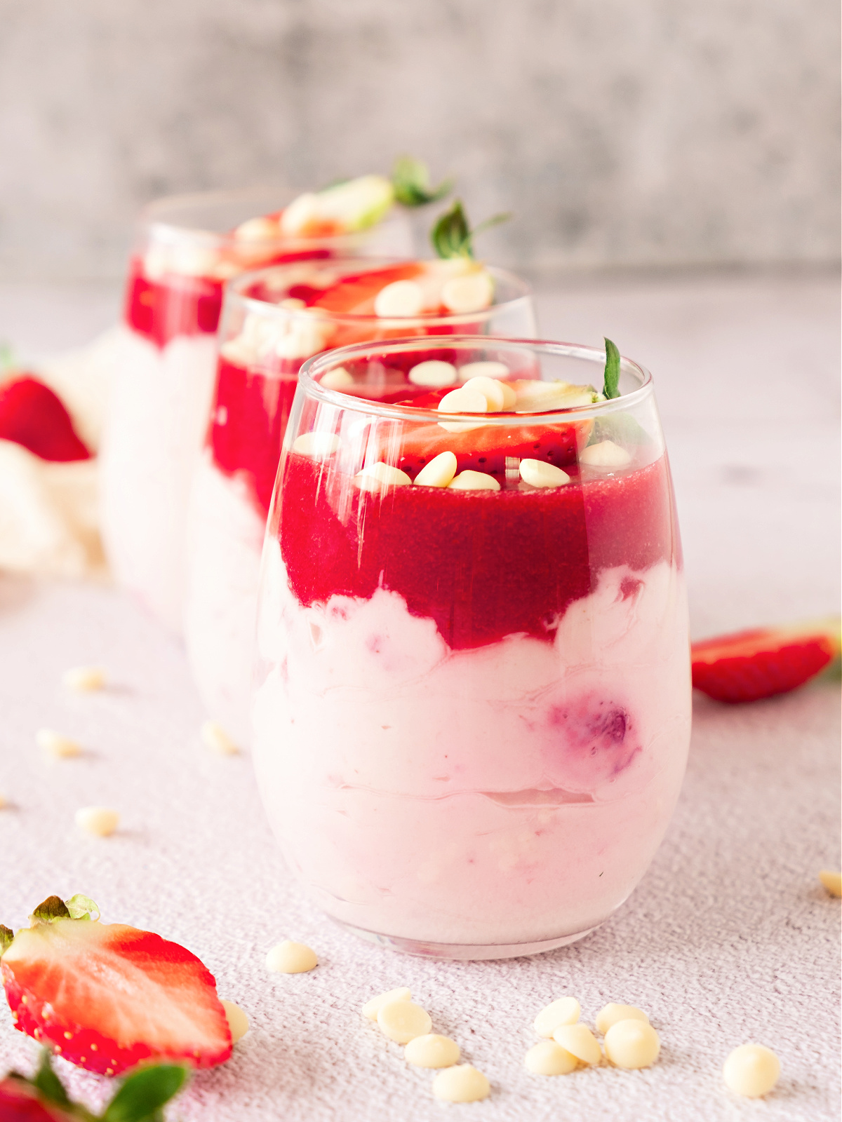 - Refrigerate the assembled mousse for 2-3 hours to allow it to set completely. Before serving, garnish with fresh strawberry slices and white chocolate chips for a touch of elegance.
